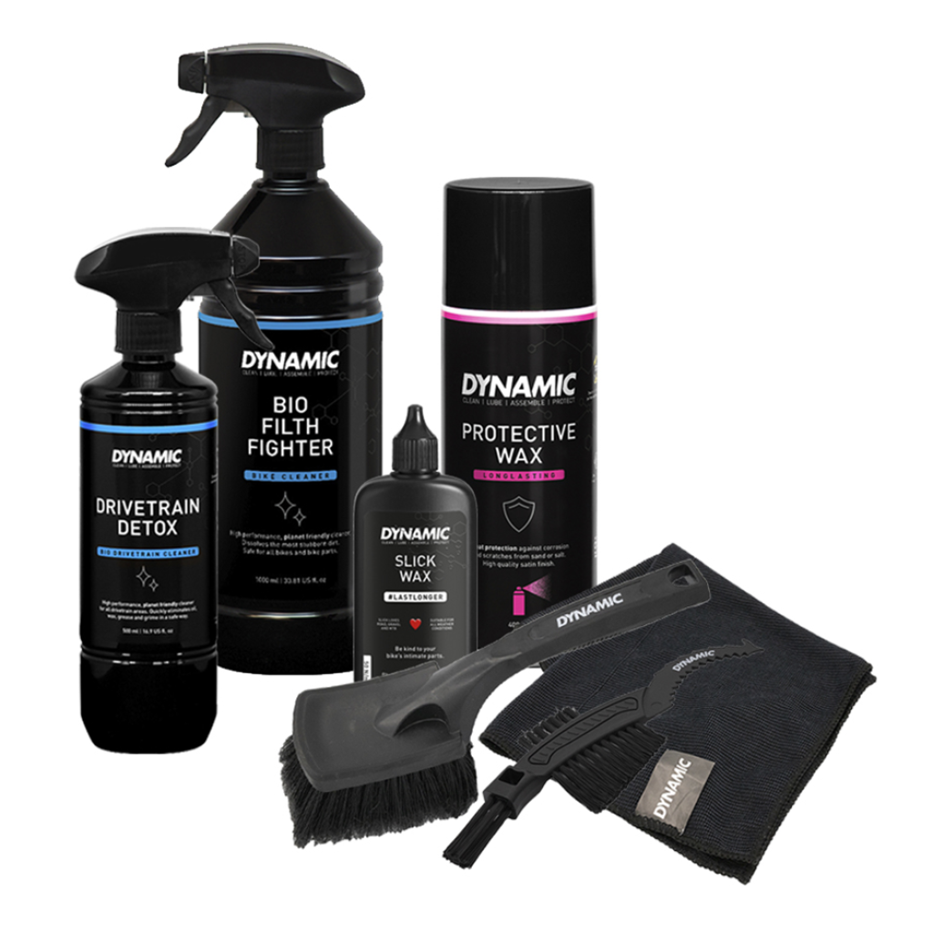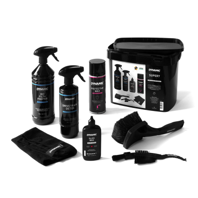 Die Dynamic Super 7! Die ultimative Fahrradpflege-Box für Rennräder, Gravelbikes, MTBs und E-Bikes.Entfette deine Kette mit Drivetrain Detox und wachse sie anschliessend mit unserem superlanganhaltenden Slick Wax. Gönn deinem Fahrrad ein Bad im Bio Filth Fighter und finishe es mit Protective Wax. Alle wichtigen Reinigungsutensilien sind im Set enthalten.Was ist drinBio Filth Fighter (1000ml),Drivetrain Detox (500ml),Slick Wax (100ml),Protective Wax (400ml),Claw Brush,Soft Washing Brush,Microfibre ClothBio Filth Fighter:Der Bio Filth Fighter ist ein effektiver, biologisch abbaubarer Fahrradreiniger für jeden Fahrradtyp! Einfache Fahrradreinigung ohne viel Chemie – mit praktischem Sprühkopf.Bio Drivetrain Detox:Dieser Reiniger entfernt schnell und sicher Verschmutzungen, Öl, Wachs und Fett. Die umweltfreundliche Formel lässt sich leicht mit Wasser abspülen und ist der einzige Reiniger seiner Art, der keinerlei Gefahrensymbole aufweist!Slick Wax:Das Kettenwachs, welches super lange hält und dafür sorgt, dass die Kette trocken und sauber bleibt. Ideal für Radfahrer, die gerne einen leichtgängigen und ruhigen Antrieb haben. Das Slick Wax ist biologisch abbaubar, einfach aufzutragen und ideal für die routinierte Pflege.Protective wax:Schütze dein Bike und lass es mit dem Dynamic Protective Wax wie neu aussehen.Soft washing brush:Die sanfte Reinigungsbürste ist ideal zum Reinigen deines Fahrradrahmens und deiner Komponenten. Die spezifische Borstenstruktur der weichen Waschbürste ist für alle Bikes und Rahmenmaterialien geeignet. Diese Bürste ist für eine schnelle Reinigung konzipiert und mit einem grossen Kopf und gummierten Kontaktzonen für einen maximalen Schutz deines Rahmens optimiert.Claw brush:Die multifunktionale Klauenbürste ist perfekt dafür geeignet, um deine Kette, Kassette, die Kettenblätter und Schaltröllchen zu reinigen. Das Werkzeug verfügt über drei Bürsten mit Nylonborsten und eine Klaue zum Abstreifen von Schlamm.Microfibre cloth:Das perfekte Reinigungstuch für alle Reinigungszwecke: Das Microfibre Cloth. Verwende dieses Tuch, um dein Fahrrad zu reinigen, zu trocknen und zu polieren. Die Mikrofasern absorbieren den Schmutz, wodurch verhindert wird, dass er sich über deinen Rahmen verteilt.