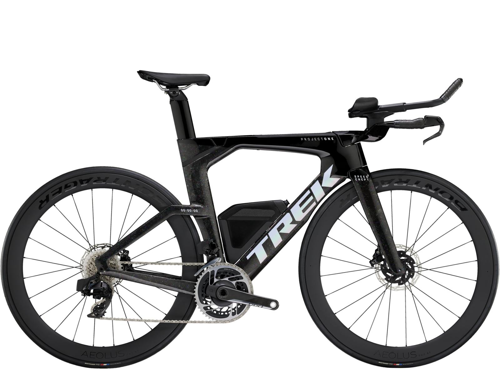 Einen ultraleichten Rahmen aus 800 Series OCLV Carbon, windschnittige Rohre mit Kammtail Virtual Foil Profil (KVF), eine Speed Concept Carbongabel mit aerodynamischem Profil, straßenglättendes IsoSpeed, integrierte Aufbewahrungslösungen für Verpflegung, Flüssigkeitsversorgung und Pannenkit, einen drahtlosen, elektronischen SRAM RED AXS 12fach-Antrieb der vorherigen Generation mit SRAM AXS Blips Schalthebeln, ein SRAM RED AXS Powermeter, eine integrierte Lenker/Vorbau-Einheit, einen triathlonspezifischen Bontrager Hilo Pro Carbonsattel, zuverlässige Scheibenbremsen und aerodynamische Bontrager Aeolus Pro 51 Laufräder aus OCLV Car