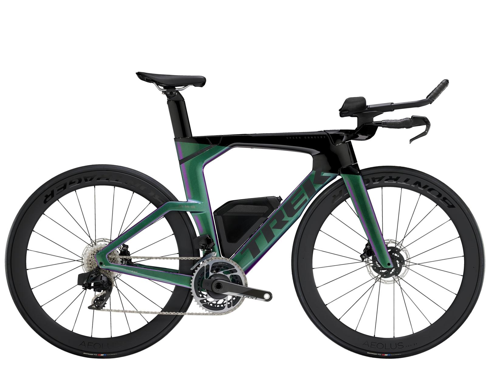 Einen ultraleichten Rahmen aus 800 Series OCLV Carbon, windschnittige Rohre mit Kammtail Virtual Foil Profil (KVF), eine Speed Concept Carbongabel mit aerodynamischem Profil, straßenglättendes IsoSpeed, integrierte Aufbewahrungslösungen für Verpflegung, Flüssigkeitsversorgung und Pannenkit, einen drahtlosen, elektronischen SRAM RED AXS 12fach-Antrieb der vorherigen Generation mit SRAM AXS Blips Schalthebeln, ein SRAM RED AXS Powermeter, eine integrierte Lenker/Vorbau-Einheit, einen triathlonspezifischen Bontrager Hilo Pro Carbonsattel, zuverlässige Scheibenbremsen und aerodynamische Bontrager Aeolus Pro 51 Laufräder aus OCLV Car